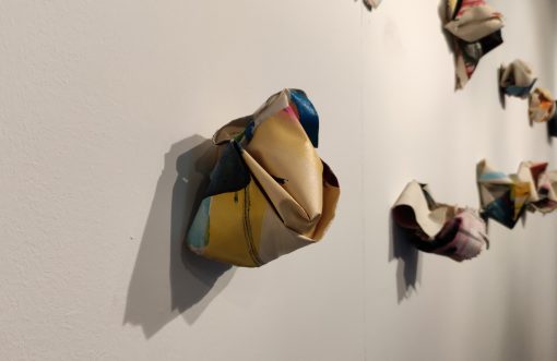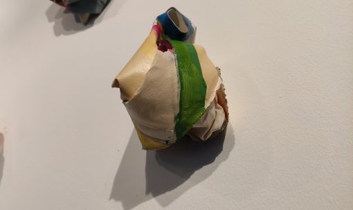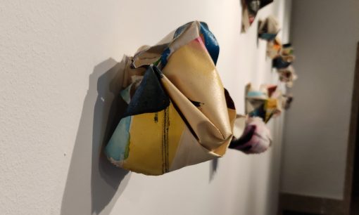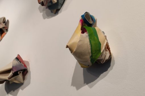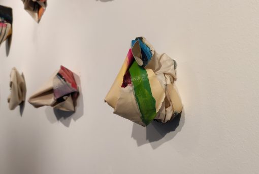 Esta serie de esculturas textiles nace de la reflexión sobre la construcción de la identidad a lo largo del tiempo. Están construidas con cuadros de hace unos años, que he destruido para ello. Tengo una identificación muy fuerte con mi trabajo, que me parece formar parte de mí. Destruir mi obra del pasado para darle nueva forma y así, una nueva vida, es una imagen de cómo el pasado construye el presente. Yo soy hoy porque fui ayer, y fui aquella. So that, destroying my work from the past, for giving it a new shape and so, a new life, it is an image of how the past builds present. La transformación es también asimilación de ese pasado. Así, lo que se esconde en el interior de las primeras esculturas, va asomando poco a poco en las siguientes, y se exhibe en las últimas de manera mucho más explícita. Las obras que sirven hoy de materia prima ya eran en volumen. El volumen forma parte de mi lenguaje plástico desde hace más de 15 años.