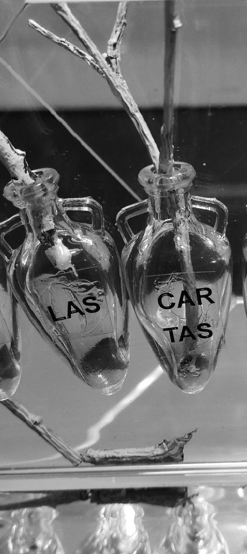 Esta obra es de la serie «Luz Dormida.» Cuando no existían ni los emails, ni los WhatsApp, ni las redes; cuando, incluso, no existía el teléfono, o era asequible a muy pocas personas. Entonces, nos comunicábamos por cartas. Algunas tardaban años en llegar y otras no llegaron nunca. Esta pieza habla de todo eso, de todas esas cartas que nunca llegaron, que se perdieron por el camino, que se ocultaron, que se secuestraron, que se censuraron, que guardaron los padres para que sus hijas no las vieran nunca.