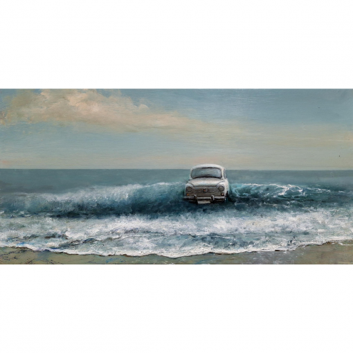 La obra representa un automóvil modelo Seat 600 color blanco a la orilla del mar al anochecer.