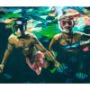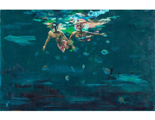 When practicing snorkel, there is sometimes a big difference between the bright surface and the dark sea bottom. The surface with the colors of the clothes or the effects of the sun on the skin, is the symbol of the known and safe world. With dark colors and those not so familiar beings around, the bottom is the symbol of mystery and uncertainty. All of us swim daily between the routine and the novelty, between the surface and the bottom, and as in the sea, to push out into the unknown can be a wonderful adventure. This painting shows both sides of the sea.
