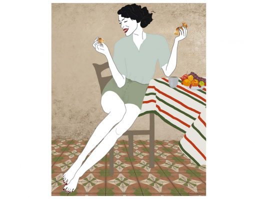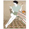 Illustration of intimate moments. Getting up late, long breakfast, coffee with milk, croissant, fruit. Everyday pleasures!